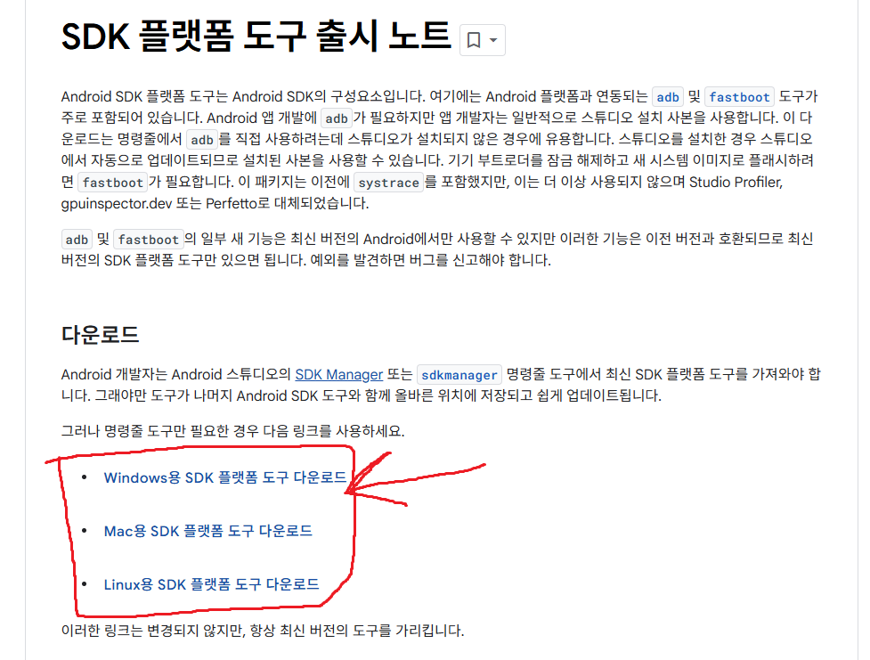 1-1. ADB는 SDK 플랫폼 도구 출시 노트 | Android Studio | Android Developers 에 들어가서 다운한다